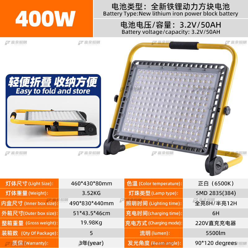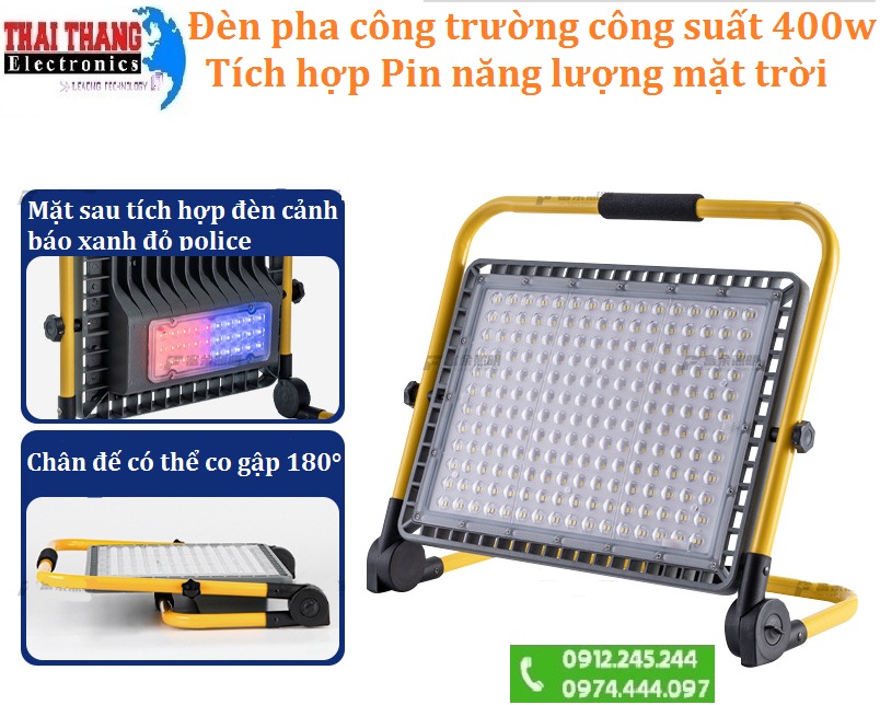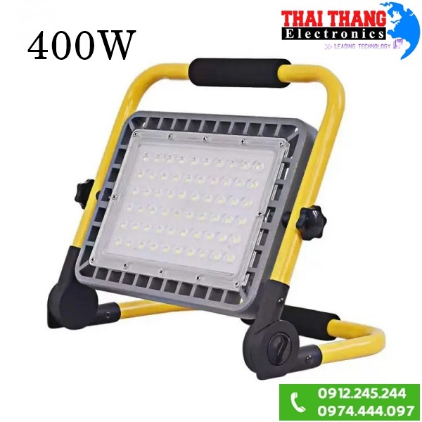 Đèn pin siêu sáng công trường Led 400W được trang bị 400 chip Led SMD 2835 công suất 400w cao cấp, chống lóa, tiết kiệm năng lượng, bền bỉ và tuổi thọ lên đến 100.000 giờ chiếu sáng. Đèn có 2 chế độ chiếu sáng gồm: Sáng mạnh và sáng vừa phù hợp với từng nhu cầu chiếu sáng của người dùng. Mặt đèn làm bằng thấu kính quang học chống lóa, tăng gấp đôi cường độ ánh sáng, giúp lan tỏa ánh sáng đồng đều và mạnh mẽ. Công tắc đèn được thiết kế bằng thép không gỉ rất sang trọng và cao cấp, đèn thiết kế giá đỡ chân gập thông minh, rất chắc chắn và cơ động, có thể điều chỉnh góc chiếu sáng của đèn lên đến 360 độ.