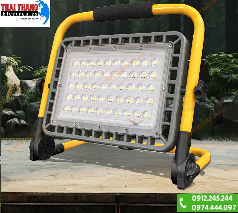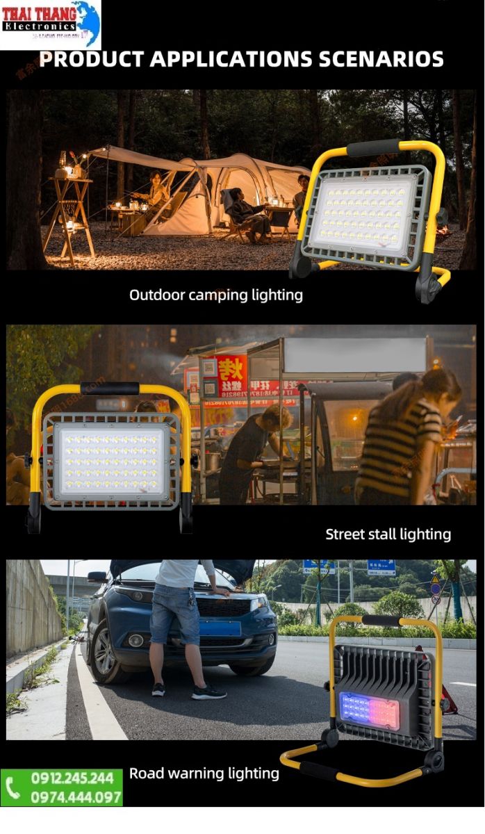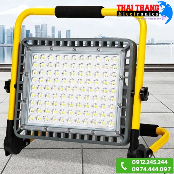 Đèn được trang bị bánh xe gắn chân đế và có thể co gập 180°, thân đèn xoay 360°, có thể tay xách hoặc di chuyển bằng chân đế, rất thuận tiện khi mang theo và sử dụng.