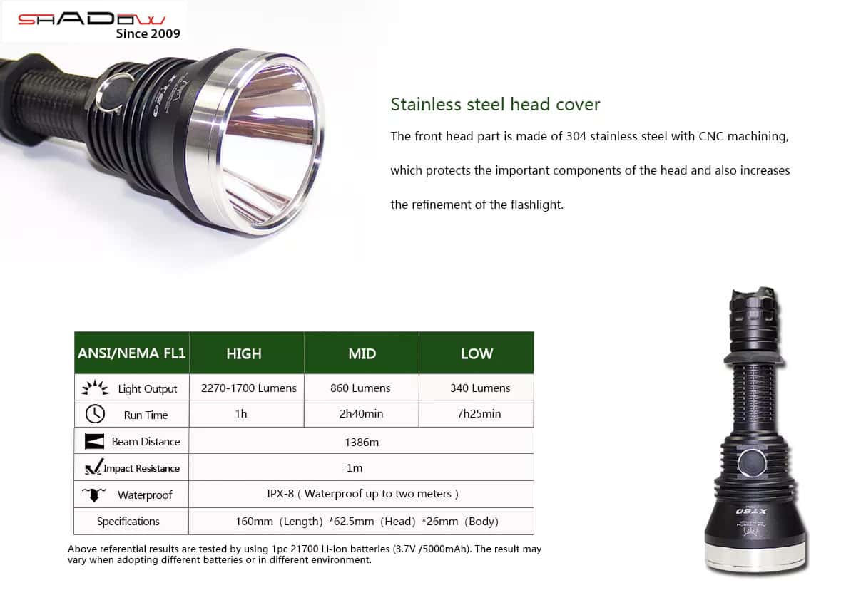 Đèn pin soi xa siêu sáng Amutorch XT60 sử dụng pin sạc Li-ion 21700 dung lượng 5000mAh, cho thời gian hoạt động 1 đến 14 giờ. Chuẩn chống nước IPX8 cho phép XT60 hoạt động tốt trong môi trường mưa bão hoặc khói bụi. Chất liệu hợp kim nhôm cho trọng lượng đèn chỉ 309g . Quá trình điện hóa Anodizing độ 3 (Anod) tăng cường độ cứng và chống ăn mòn bề mặt, đầu đèn được trang bị thêm vòng INOX siêu cứng giúp đèn chịu được tác động mạnh như rơi rớt ở độ cao 1m.