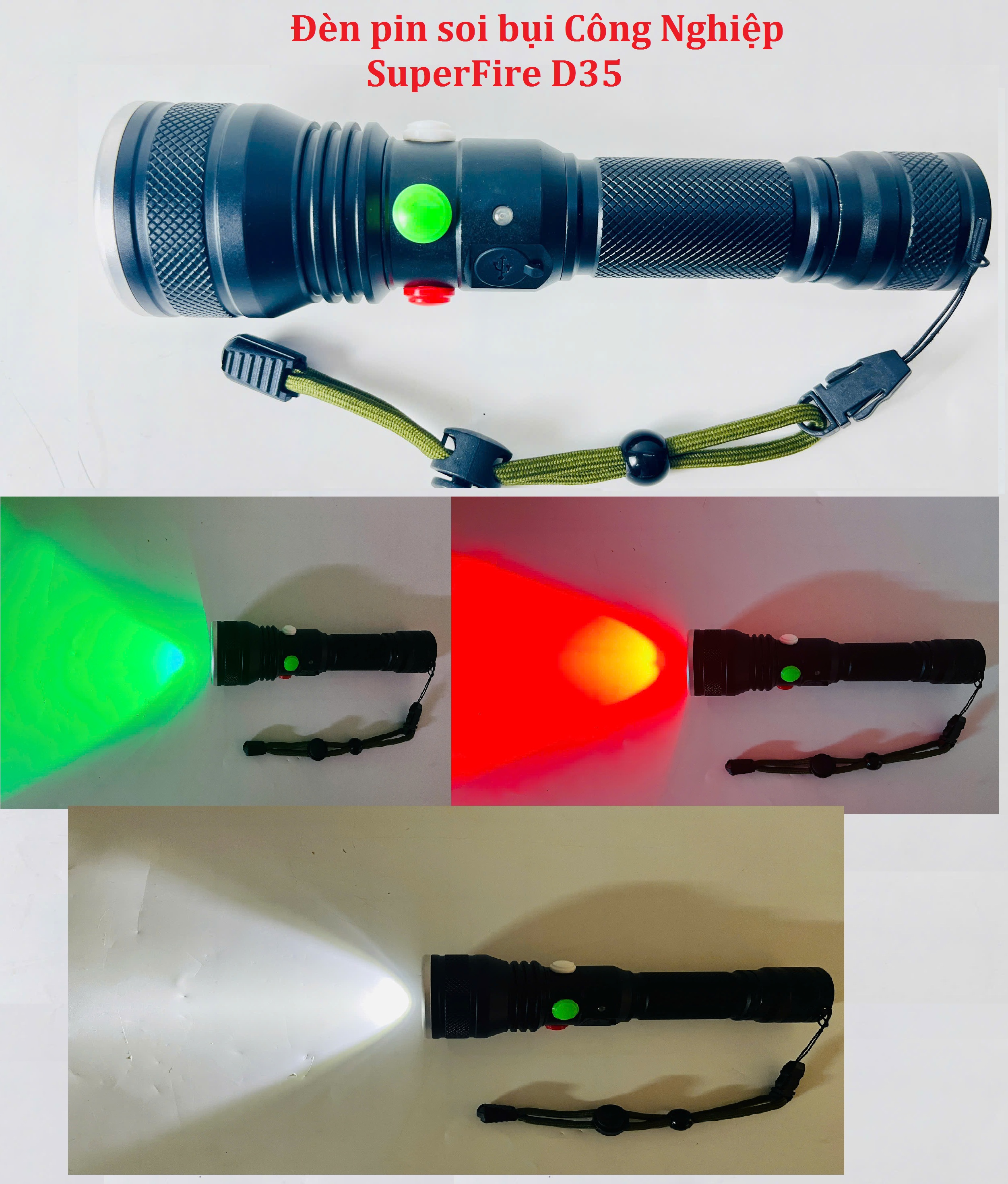 Đèn pin soi bụi đa năng D35 trang bị hệ thống chiếu sáng led 3 in 1 gồm led trắng có cường độ sáng 161 lumens với 3 chế độ sáng mạnh, sáng vừa và nhấp nháy. Led đỏ có bước sóng 635nm với 2 chế độ là đỏ mạnh và đỏ nhấp nháy; led xanh lá bước sóng 508nm có 2 chế độ là xanh mạnh và xanh nhấp nháy. Đèn có khoảng cách soi chiếu 76m nhờ chóa đèn tráng gương tăng độ phản xạ sáng. 3 công tắc cho 3 led được thiết kế riêng biệt giúp quá trình bật, tắt hoặc chuyển chế độ nhanh chóng. Đèn sử dụng pin sạc 18650 hoặc 3 pin AAA cho thời gian hoạt động 4 giờ cho ánh sáng trắng, 8 giờ sáng đỏ và 14 giờ khi bật đèn xanh lá. Chất liệu đèn làm từ hợp kim nhôm siêu nhẹ cho trọng lượng chỉ 150g, chất liệu này cũng giúp đèn có độ bền cao khi có thể chịu rơi rớt ở độ cao 1m. Chuẩn chống nước IP44 cho phép đèn hoạt động tốt trong môi trường khắc nghiệt.