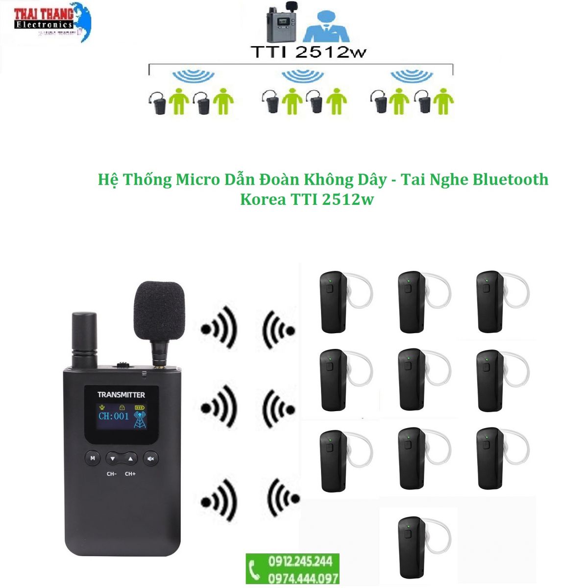 Hệ thống micro dẫn đoàn không dây cho hướng dẫn viên, tai nghe Bluetooth TTI 2512w Korea