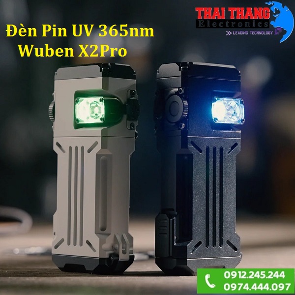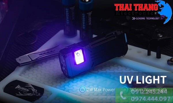 Đèn pin UV cực tím Wuben X2 Pro được thiết kế thêm cụm led trên thân đèn gồm 1 led sáng trắng dịu nhẹ với cường độ sáng đạt 400 lumen và led cảnh báo RGB gồm led UV bước sóng 365nm, led sáng đỏ, đỏ nhấp nháy, nhấp nháy xanh dương đỏ, nhấp nháy vàng đỏ, nhấp nháy xanh lá đỏ. Cụm led này có thể điều chỉnh xoay 20° giúp người dùng dễ dàng điều chỉnh góc chiếu.